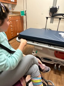 The lab tech, Justin, came into the waiting area to draw blood and had zero issues. I think all the commotion in the waiting room and activity distracted Emily. She was in her wheelchair with Mom and Dad by her side, and the blood pressure cuff was out of sight. She barely made a peep, and her squirming was easy to minimize.